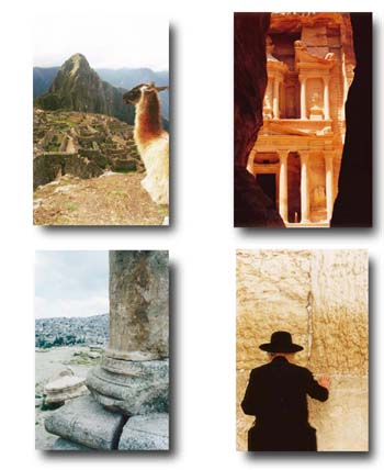Photos at left, clockwise from top left: Machu Picchu; Petra; Western Wall, Jerusalem; Amman, Jordan | ||||||||||||||||