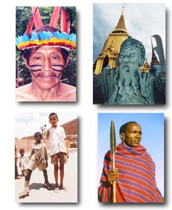 Photos at right, clockwise from top left: Bora man, Amazon; Royal Palace, Bangkok; Massai man, Kenya; Beggar boys, India |